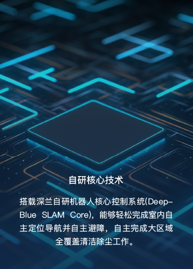 搭載深蘭自研機器人核心控制系統(tǒng)(DeepBlue SLAM Core),能夠輕松完成室內(nèi)自主定位導(dǎo)航并自主避障,自主完成大區(qū)域全覆蓋清潔除塵工作。