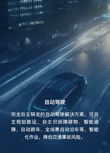 自主產(chǎn)權(quán)的多傳感器融合技術(shù)、自動(dòng)駕駛算法,具備高環(huán)境感知能力,可實(shí)現(xiàn)室外復(fù)雜道路、動(dòng)態(tài)變化等場(chǎng)景下的實(shí)時(shí)定位、自主導(dǎo)航、停障繞障和自主安全作業(yè)等功能。