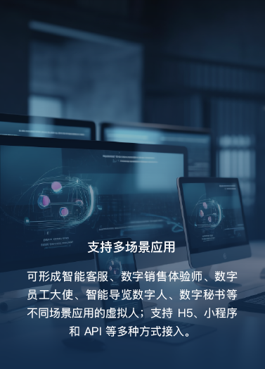 可形成智能客服、數(shù)字銷售體驗(yàn)師、數(shù)字員工大使、智能導(dǎo)覽數(shù)字人、數(shù)字秘書等不同場景應(yīng)用的虛擬人;支持 H5、小程序和 API 等多種方式接入。