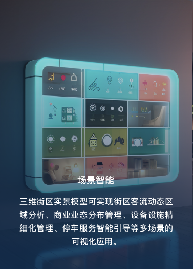 三維街區(qū)實(shí)景模型可實(shí)現(xiàn)街區(qū)客流動(dòng)態(tài)區(qū)域分析、商業(yè)業(yè)態(tài)分布管理、設(shè)備設(shè)施精細(xì)化管理、停車服務(wù)智能引導(dǎo)等多場(chǎng)景的可視化應(yīng)用。